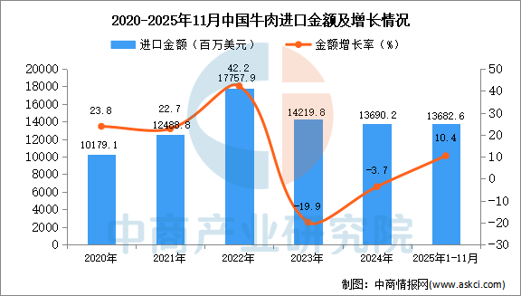 从金额方面来看,数据显示,2025年1-11月中国牛肉进口金额13682.6百万美元,同比增长10.4%。
