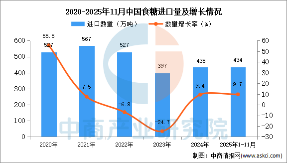 中商情报网讯:据中商产业研究院数据库显示,2024年中国食糖进口量435万吨,同比增长9.4%。最新数据显示,2025年1-11月中国食糖进口量434万吨,同比增长9.7%。