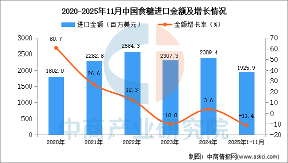 从金额方面来看,数据显示,2025年1-11月中国食糖进口金额1925.9百万美元,同比下降11.4%。