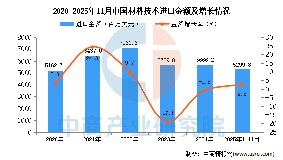 从金额方面来看,数据显示,2025年1-11月中国材料技术进口金额5299.8百万美元,同比增长2.8%。