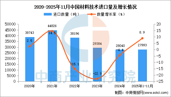 中商情报网讯:据中商产业研究院数据库显示,2024年中国材料技术进口量28040吨,同比下降4.4%。最新数据显示,2025年1-11月中国材料技术进口量27993吨,同比增长8.9%。