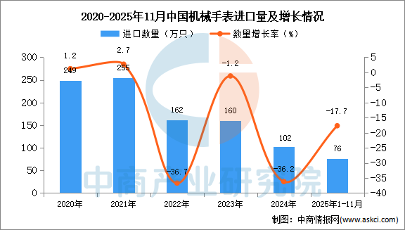 中商情报网讯:据中商产业研究院数据库显示,2024年中国机械手表进口量102万只,同比下降36.2%。最新数据显示,2025年1-11月中国机械手表进口量76万只,同比下降17.7%。
