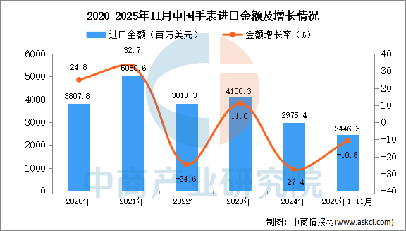 从金额方面来看,数据显示,2025年1-11月中国手表进口金额2446.3百万美元,同比下降10.8%。