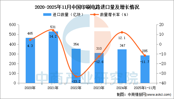 中商情报网讯:据中商产业研究院数据库显示,2024年中国印刷电路进口量347亿块,同比增长12.1%。最新数据显示,2025年1-11月中国印刷电路进口量285亿块,同比下降11.7%。