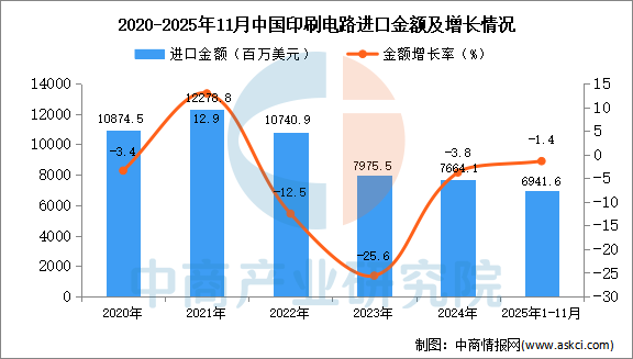 从金额方面来看,数据显示,2025年1-11月中国印刷电路进口金额6941.6百万美元,同比下降1.4%。