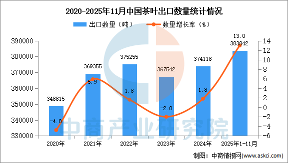 中商情报网讯:据中商产业研究院数据库显示,2024年我国茶叶的出口量374118吨,同比增长1.8%。最新数据显示,2025年1-11月中国茶叶出口量383842吨,同比增长13%。