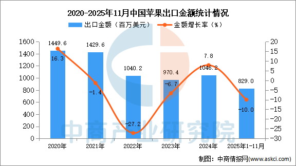 从金额方面来看,数据显示,2025年1-11月中国苹果出口金额829百万美元,同比下降10%。