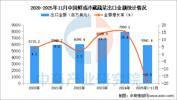 2025年11月中国鲜或冷藏蔬菜出口量及金额增长情况