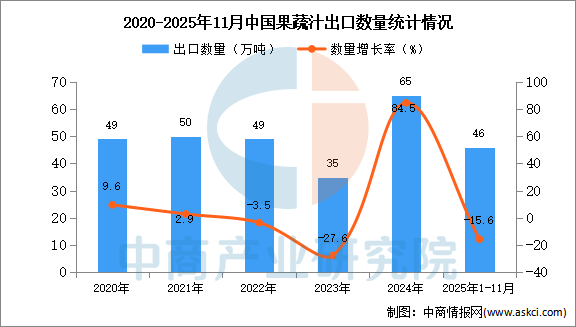 2025年11月中国果蔬汁出口量及金额增长情况