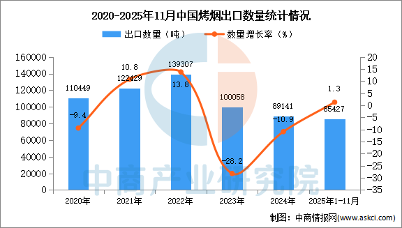 中商情报网讯:据中商产业研究院数据库显示,2024年我国烤烟的出口量89141吨,同比下降10.9%。最新数据显示,2025年1-11月中国烤烟出口量85427吨,同比增长1.3%。