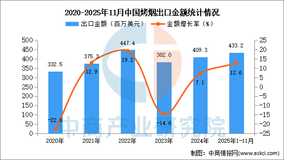 从金额方面来看,数据显示,2025年1-11月中国烤烟出口金额433.2百万美元,同比增长12.6%。