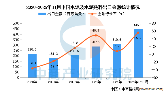 2025年11月中国水泥及水泥熟料出口量及金额增长情况