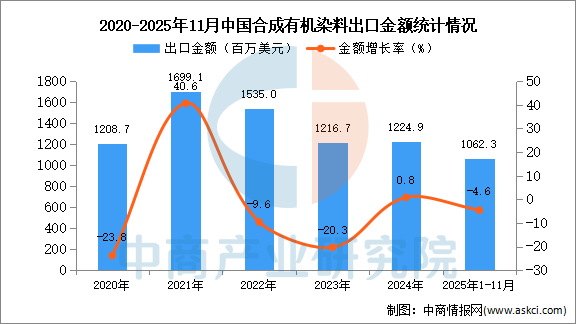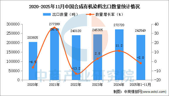 2025年11月中国合成有机染料出口量及金额增长情况