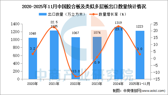 中商情报网讯:据中商产业研究院数据库显示,2024年我国胶合板及类似多层板出口量1319万立方米,同比增长23.1%。最新数据显示,2025年1-11月中国胶合板及类似多层板出口量1223万立方米,同比增长3%。