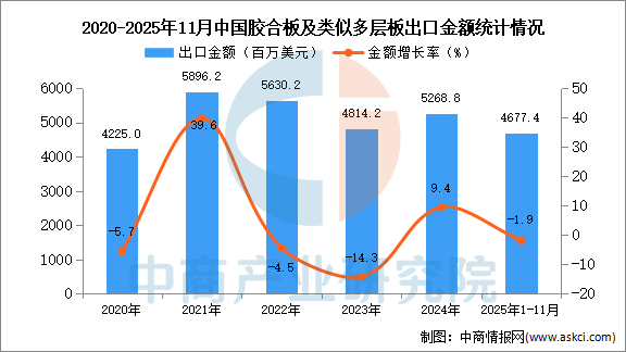 2025年11月中国胶合板及类似多层板出口量及金额增长情况