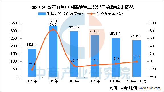 2025年11月中国磷酸氢二铵出口量及金额增长情况