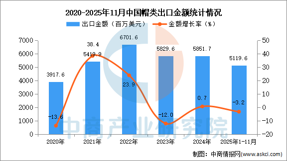 2025年11月中国帽类出口量及金额增长情况
