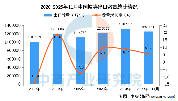 中商情报网讯:据中商产业研究院数据库显示,2024年我国帽类出口量1318517万个,同比增长8.7%。最新数据显示,2025年1-11月中国帽类出口量1257181万个,同比增长5.6%。