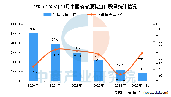 中商情报网讯:据中商产业研究院数据库显示,2024年我国裘皮服装出口量1202吨,同比下降44.3%。最新数据显示,2025年1-11月中国裘皮服装出口量807吨,同比下降25.4%。
