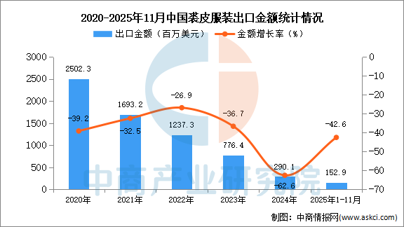 从金额方面来看,数据显示,2025年1-11月中国裘皮服装出口金额152.9百万美元,同比下降42.6%。