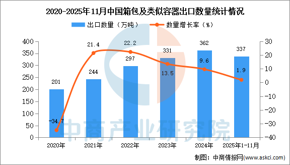中商情报网讯:据中商产业研究院数据库显示,2024年我国箱包及类似容器出口量362万吨,同比增长9.6%。最新数据显示,2025年1-11月中国箱包及类似容器出口量337万吨,同比增长1.9%。