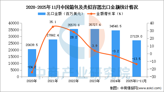 2025年11月中国箱包及类似容器出口量及金额增长情况
