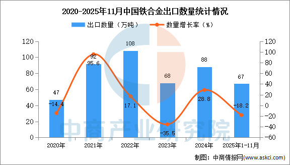 中商情报网讯:据中商产业研究院数据库显示,2024年我国铁合金的出口量88万吨,同比增长28.8%。最新数据显示,2025年1-11月中国铁合金出口量67万吨,同比下降18.2%。