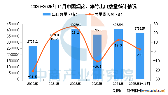 中商情报网讯:据中商产业研究院数据库显示,2024年我国烟花、爆竹出口量408396吨,同比增长12.3%。最新数据显示,2025年1-11月中国烟花、爆竹出口量378325吨,同比增长2.2%。