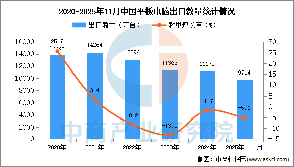 中商情报网讯:据中商产业研究院数据库显示,2024年中国平板电脑出口量11170万台,同比下降1.7%。最新数据显示,2025年1-11月中国平板电脑出口量9714万台,同比下降5.1%。
