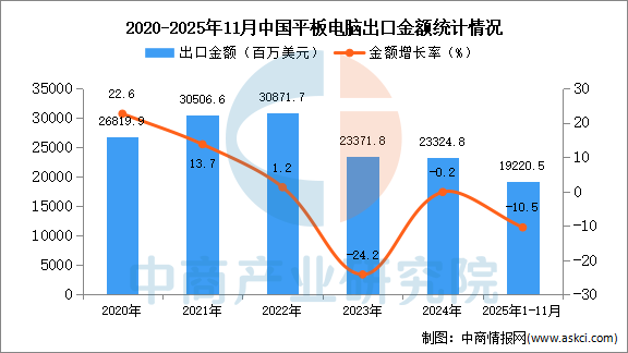 从金额方面来看,数据显示,2025年1-11月中国平板电脑出口金额19220.5百万美元,同比下降10.5%。