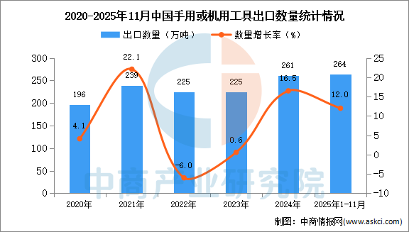 中商情报网讯:据中商产业研究院数据库显示,2024年中国手用或机用工具出口量261万吨,同比增长16.5%。最新数据显示,2025年1-11月中国手用或机用工具出口量264万吨,同比增长12%。
