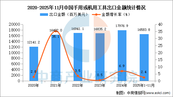 从金额方面来看,数据显示,2025年1-11月中国手用或机用工具出口金额16583.8百万美元,同比增长2.4%。