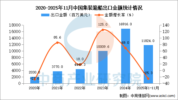从金额方面来看,数据显示,2025年1-11月中国集装箱船出口金额11824百万美元,同比下降25.3%。