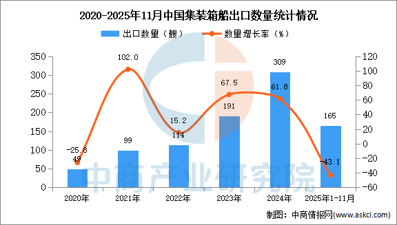 中商情报网讯:据中商产业研究院数据库显示,2024年中国集装箱船出口量309艘,同比增长61.8%。最新数据显示,2025年1-11月中国集装箱船出口量165艘,同比下降43.1%。