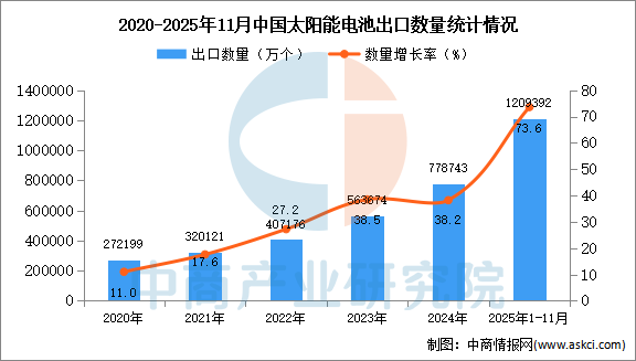 2025年11月中国太阳能电池出口量及金额增长情况