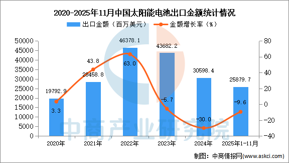 从金额方面来看,数据显示,2025年1-11月中国太阳能电池出口金额25879.7百万美元,同比下降9.6%。