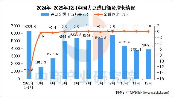 从金额方面来看,2025年12月中国大豆进口金额3877.1百万美元,同比增长持平;1-12月中国大豆进口金额50327.2百万美元,同比下降4.6%。