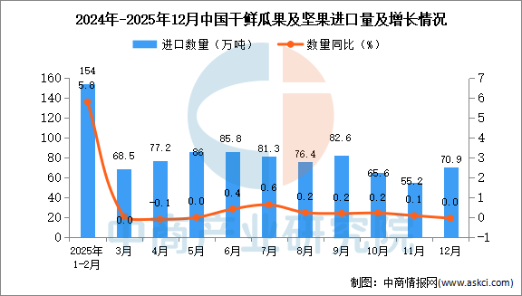 中商情报网讯:据中商产业研究院数据库显示,2025年12月中国干鲜瓜果及坚果进口量70.9万吨,同比增长持平;1-12月中国干鲜瓜果及坚果进口量908.2万吨,同比增长13.4%。