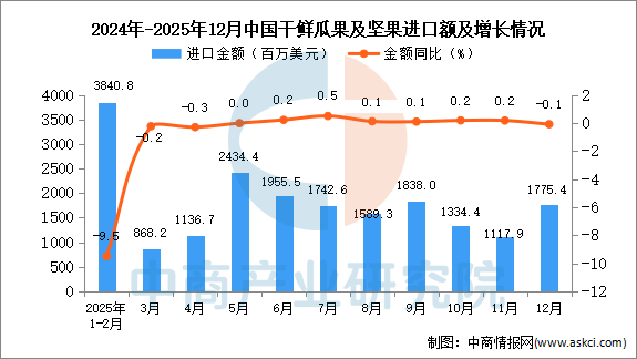 2025年12月中国干鲜瓜果及坚果进口量及金额增长情况