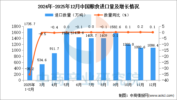 中商情报网讯:据中商产业研究院数据库显示,2025年12月中国粮食进口量1086.4万吨,同比增长0.1%;1-12月我国粮食累计进口量14056.3万吨,同比下降10.8%。