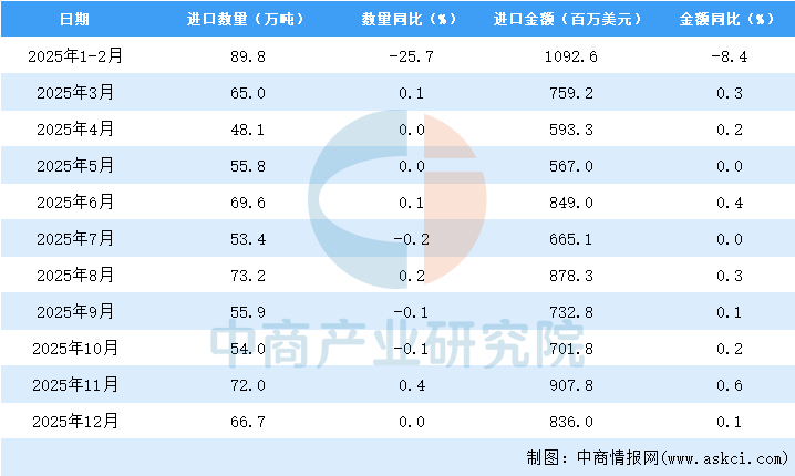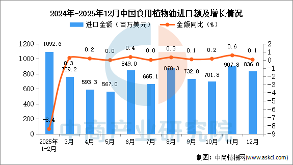 2025年12月中国食用植物油进口量及金额增长情况