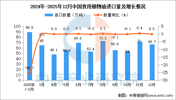 中商情报网讯:据中商产业研究院数据库显示,2025年12月中国食用植物油进口量66.7万吨,同比增长持平;1-12月我国食用植物油累计进口量693.6万吨,同比下降3.2%。