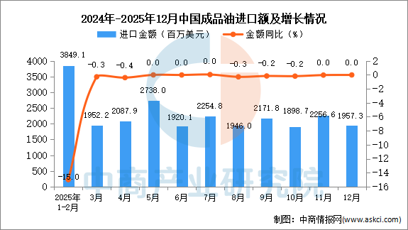 2025年12月中国成品油进口量及金额增长情况
