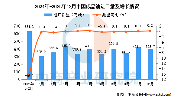 中商情报网讯:据中商产业研究院数据库显示,2025年12月中国成品油进口量398.7万吨,同比增长0.2%;1-12月中国成品油进口量4241.8万吨,同比下降12%。
