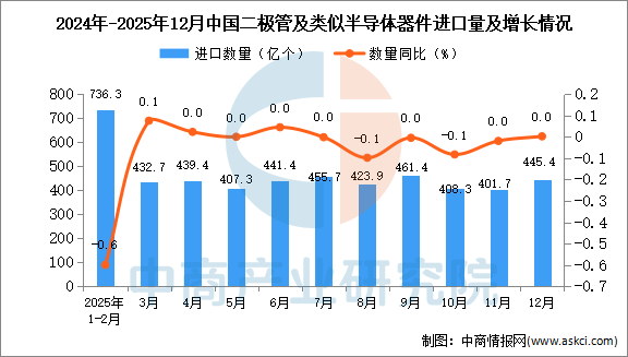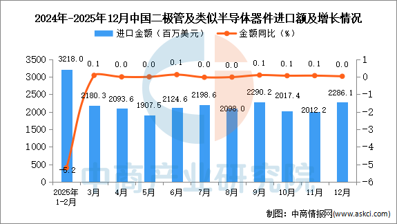 2025年12月中国二极管及类似半导体器件进口量及金额增长情况