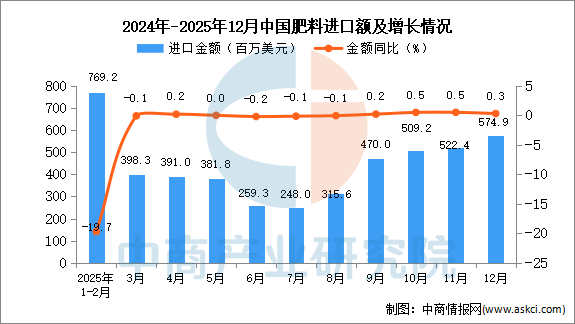 从金额方面来看,2025年12月中国肥料进口金额574.9百万美元,同比增长0.3%;1-12月中国肥料进口金额4821.5百万美元,同比增长5.6%。
