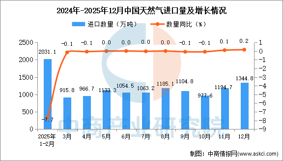 中商情报网讯:据中商产业研究院数据库显示,2025年12月中国天然气进口量1344.8万吨,同比增长0.2%;1-12月中国天然气进口量12786.5万吨,同比下降2.8%。