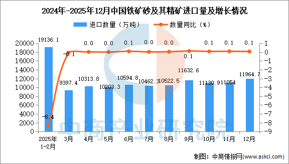 中商情报网讯:据中商产业研究院数据库显示,2025年12月中国铁矿砂及其精矿进口量11964.7万吨,同比增长0.1%;1-12月中国铁矿砂及其精矿进口量125870.9万吨,同比增长1.8%。