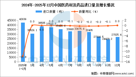 中商情报网讯:据中商产业研究院数据库显示,2025年12月中国医药材及药品进口量27025.4吨,同比增长持平;1-12月中国医药材及药品进口量363692.2吨,同比下降9.4%。