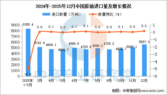 中商情报网讯:据中商产业研究院数据库显示,2025年12月中国原油进口量5597.3万吨,同比增长0.2%;1-12月中国原油进口量57772.6万吨,同比增长4.4%。